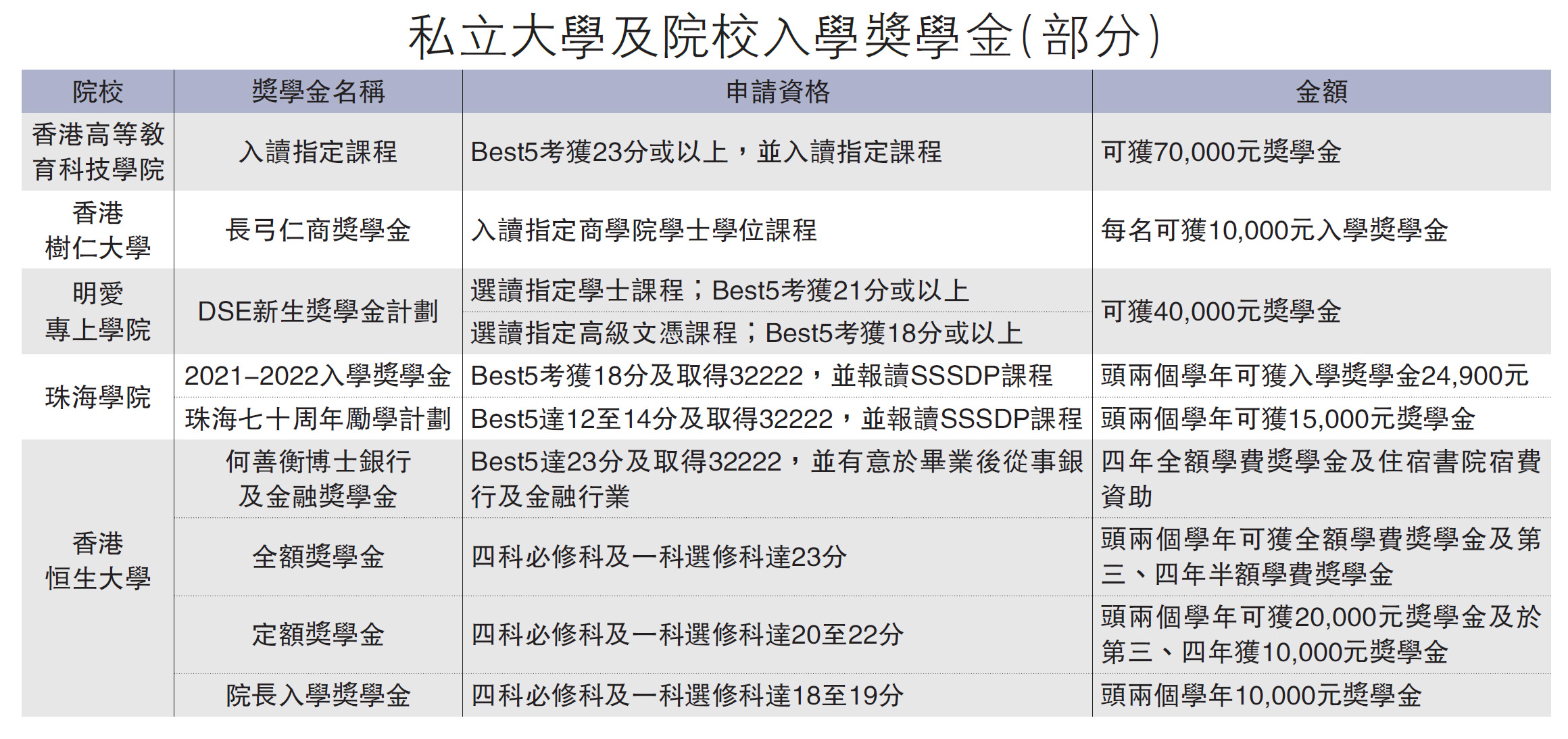 其他設立獎學金的自資院校還有香港樹仁大學、明愛專上學院、珠海學院和香港恒生大學,部分課程五科成績至少有12分就可以申請。