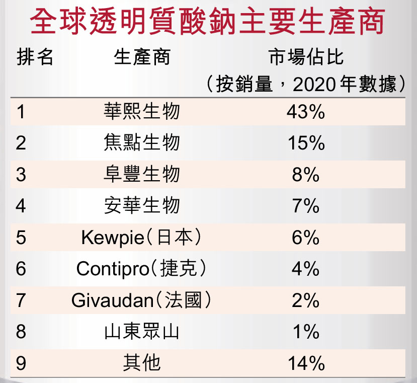 天風證券食品飲料行業分析師吳文德表示,中國是全球最大透明質酸鈉原料生產銷售國,2019年中國透明質酸鈉原料的總銷量佔全球總銷量的81.0%。中國生產食品級透明質酸鈉原料供應國外品牌多年,上游產業鏈成熟,政策放開後我國透明質酸鈉入食空間潛力很大。(見附表)