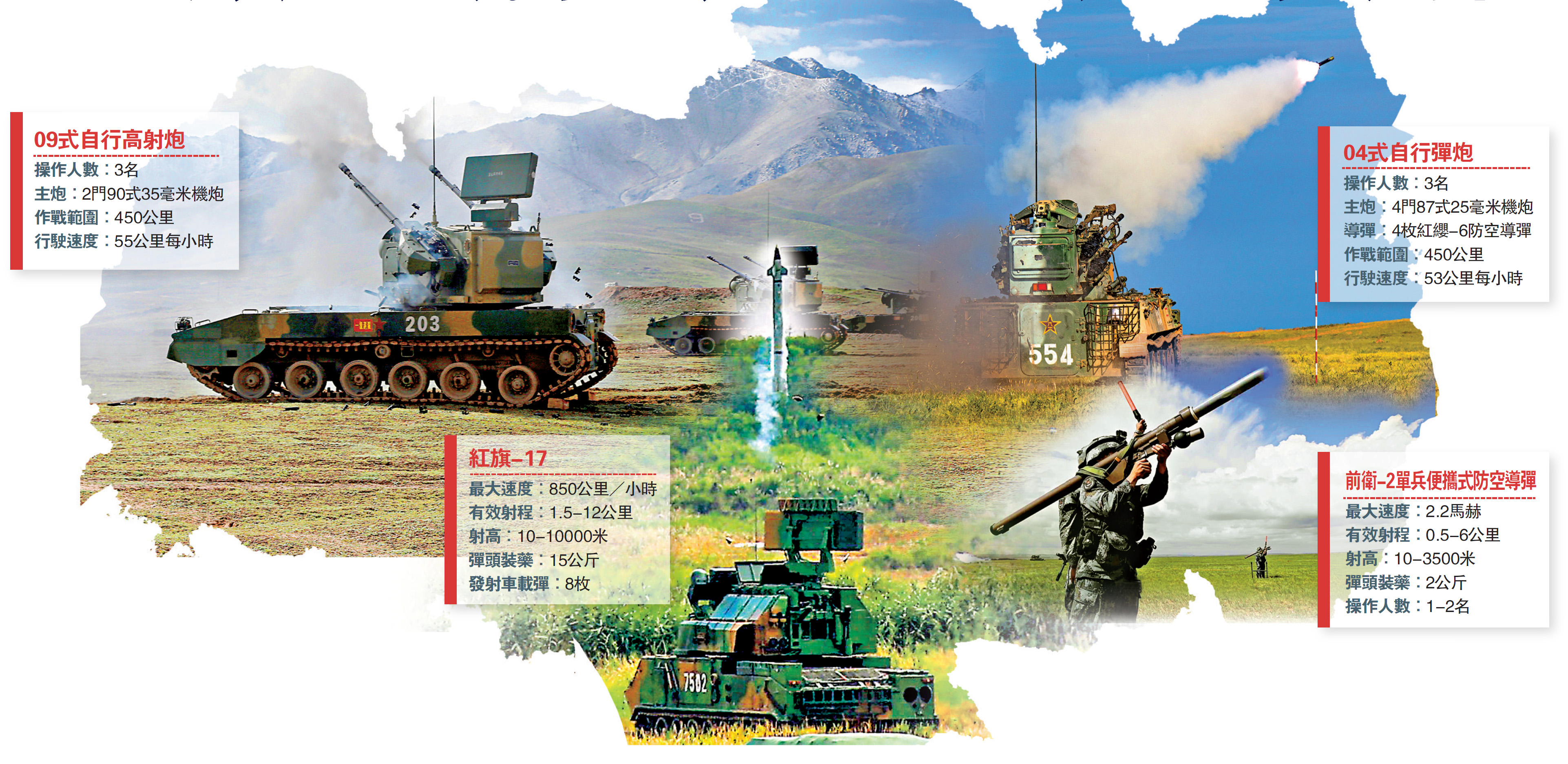 「西部·聯合-2021」演習今日起在寧夏青銅峽合同戰術訓練基地舉行,紅旗-17、4-25彈炮結合武器系統等將亮相演習場。防空力量是陸軍作戰體系的重要組成部分,依託紅旗-16、紅旗-17、紅旗-7B、紅纓-6防空導彈,4-25防空彈炮、雙35高射炮,以及電子干擾車,陸軍構築起高中低空、多元一體的防空天網,靠前配置、以攻助防。其中,紅旗-17定位為坦克裝甲部隊的「貼身防空保護傘」。\馬浩亮(文)
