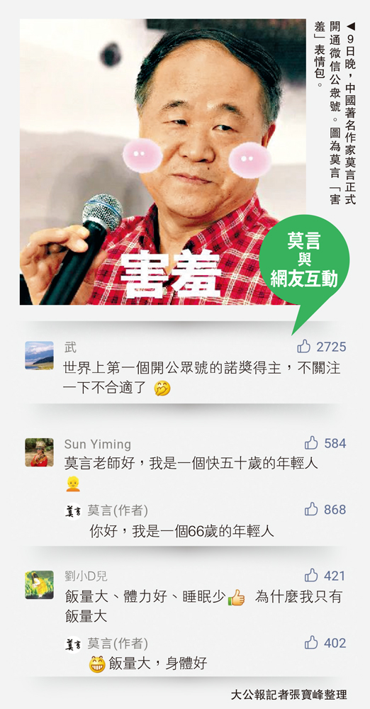探討人生/莫言首開公眾號\大公報記者 張寶峰北京報道