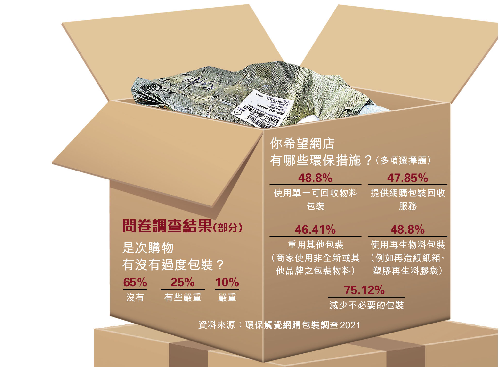 網上購物風氣日盛,但網購貨品過度包裝的問題隨之而來。環保觸覺的問卷調查發現,平均每網購一件貨品,速遞公司便使用2.71種物料進行包裝,最誇張的一件貨品竟用了9種包裝材料重重包裹着,推算過去一年全港產生約7.8億件網購包裝廢物,問題比去年嚴重,但市民的環保意識反而下降。環保觸覺認為商家應減少不必要的包裝,或採用可回收的物料,並建議政府將網購包裝納入管制範圍,訂立生產者責任制,從源頭減廢,避免垃圾圍城。