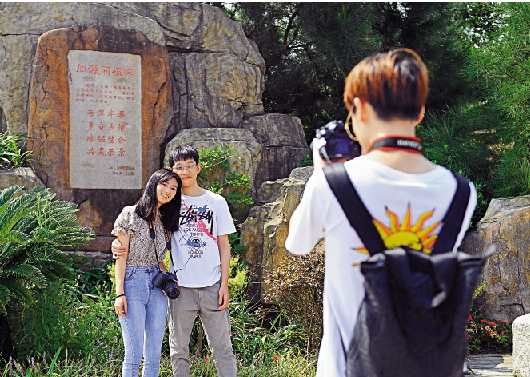 8月19日,浙江溫州,一對台灣情侶在洞頭半屏山以同源同根碑為背景合影。當日,十餘名台灣青年齊聚溫州洞頭,以光影藝術記錄甌越(溫州古代稱「甌越」)風情。