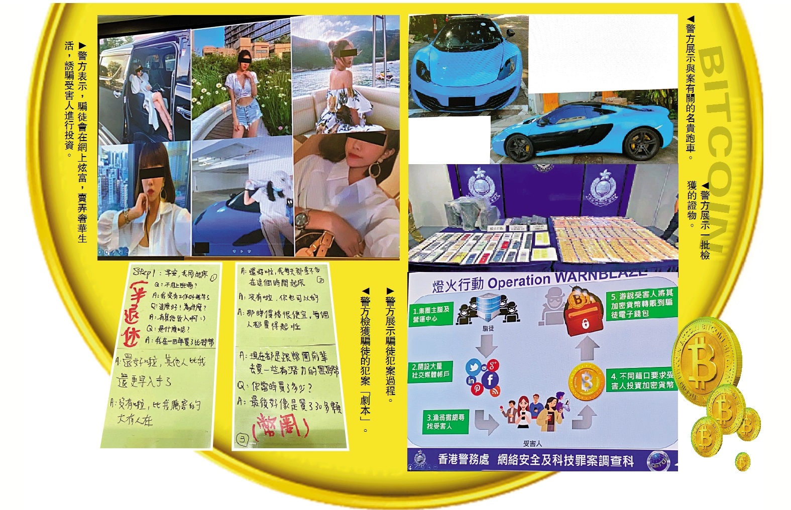 網絡安全及科技罪案調查科科技罪案組警司譚威信說,騙徒租用本港的商業大廈作為營運中心,而且分工仔細,有資訊科技人員、辦公室接待員等角色,又會聘請年輕人作推廣員,在社交媒體上找尋潛在受害人,並在網上炫富,賣弄奢華生活方式,展示現金、遊艇、跑車,以誘騙受害人進行投資活動。