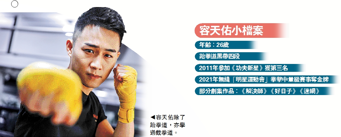 容天佑自小學習跆拳道,現已考獲黑帶四段,他亦曾學習截拳道。在今年東京奧運舉行前,他接到通知,要參加公司的奧運特備節目《明星運動會》的拳擊賽事。天佑在拳館接受大公報記者專訪時,談到練習拳擊的經歷,他說:「得三個星期準備,那時我每天一早便去練拳,接着開工,有時下午再加操兩小時,就像職業拳手一樣,地獄式訓練。」