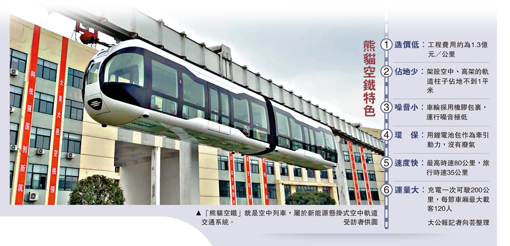 其實,「熊貓空鐵」就是空中列車,屬於新能源懸掛式空中軌道交通系統,因外形採用了酷似寫意黑白的熊貓元素而得名,由中唐空鐵集團於2016年開始,聯同西南交通大學國家重點實驗室研發。