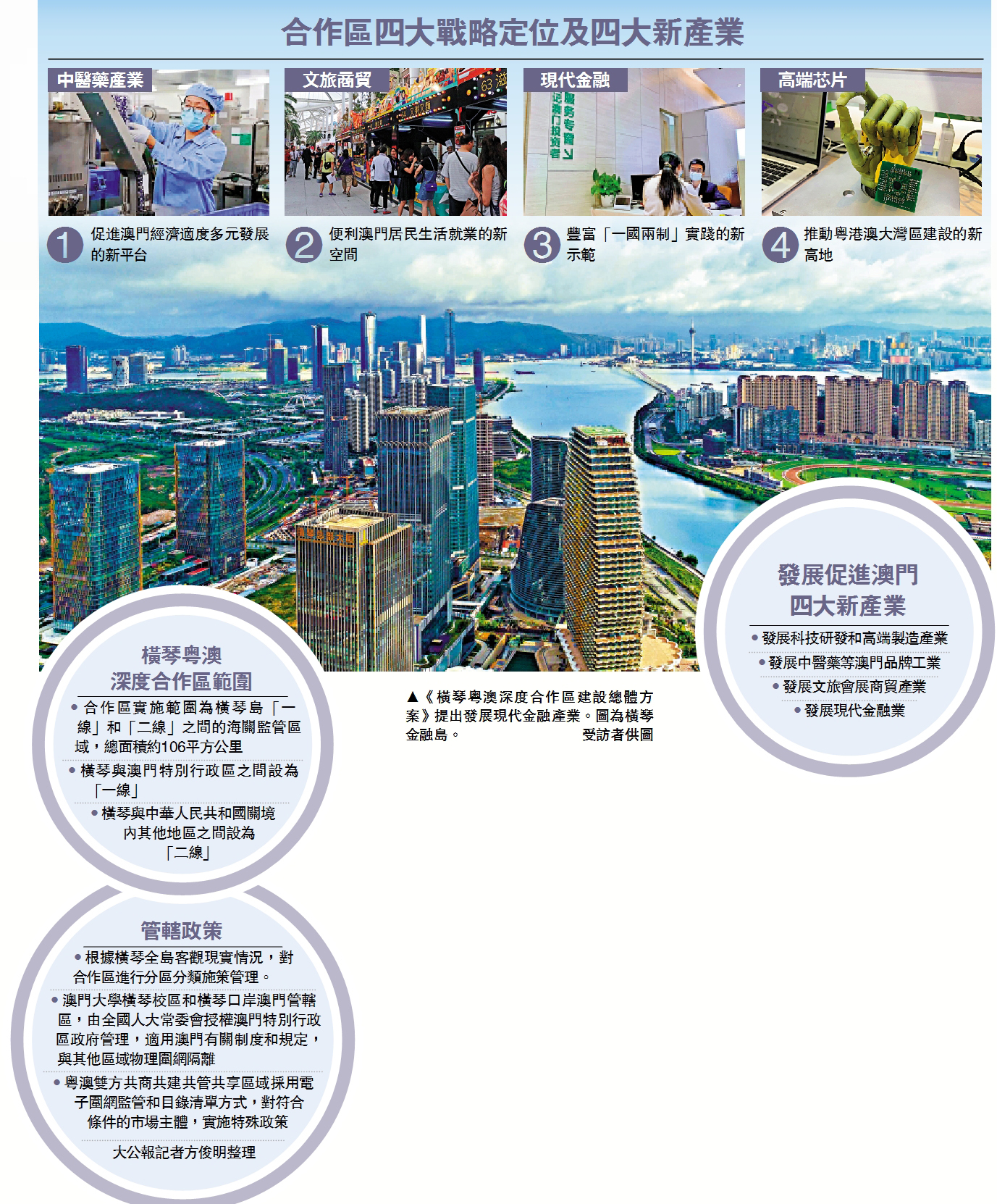中共中央、國務院5日印發《橫琴粵澳深度合作區建設總體方案》(下稱《方案》),確立合作區四個「新」戰略定位:促進澳門經濟適度多元發展的新平台、便利澳門居民生活就業的新空間、豐富「一國兩制」實踐的新示範、推動粵港澳大灣區建設的新高地;要支持澳門發展四大新產業:科技研發和高端製造產業、中醫藥等澳門品牌工業、文旅會展商貿產業和現代金融產業。到2035年,琴澳一體化發展體制機制更加完善,基本實現促進澳門經濟適度多元發展目標。