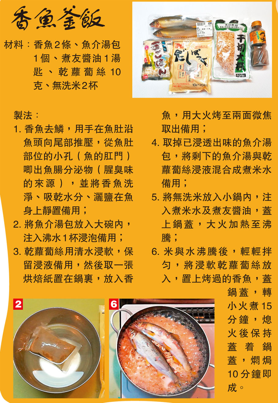 材料︰香魚2條、魚介湯包1個、煮友醬油1湯匙、乾蘿蔔絲10克、無洗米2杯