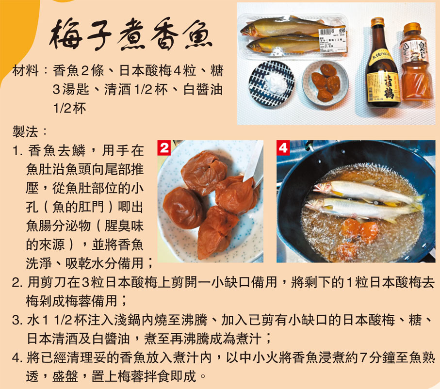 材料︰香魚2條、日本酸梅4粒、糖3湯匙、清酒1/2杯、白醬油1/2杯