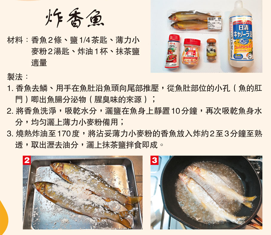 材料︰香魚2條、鹽1/4茶匙、薄力小麥粉2湯匙、炸油1杯、抹茶鹽適量
