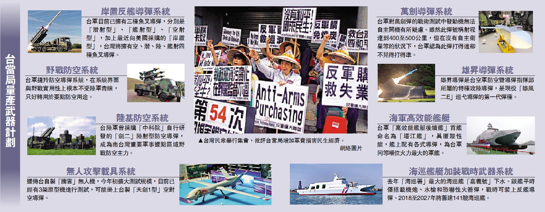 台當局「行政院」16日通過「海空戰力提升計劃特別條例」草案,將分5年編列新台幣2400億元(約675億港元)採購雄風、天弓等系列導彈共8個項目,且皆為自產。對於有記者問「台當局計劃在未來五年內大幅擴充軍費,並聲稱來自大陸的威脅正在增加」,中國外交部趙立堅首先澄清「這不是外交問題」。他強調,台灣當局任何以武謀「獨」、以武拒統的圖謀都是自不量力,必將失敗。