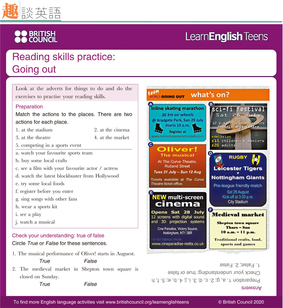 Look at the adverts for things to do and do the exercises to practise your reading skills.