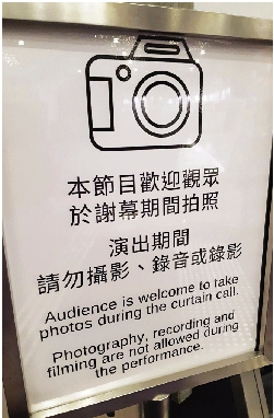 本欄五月份連續兩期談論在音樂廳內拍照的問題。當時得到康樂及文化事務署確認,由他們主辦的節目,一般容許在謝幕時拍照。他們亦馬上安排調整演出前的兩文三語廣播,從一律禁止拍照,改為「歡迎觀眾於謝幕時拍照」。最近出席香港文化中心音樂會,留意到廣播已經作出修改,而且在入場位置,以告示牌說明新措施(附圖)。當局從善如流,值得肯定。