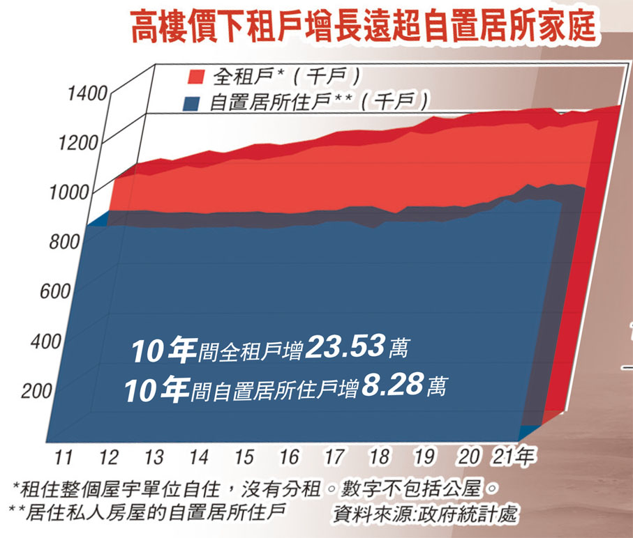 翻查今年2月全港家庭租戶有123萬戶,正處於歷史高位,較2011年即十年前首季的99.56萬戶,增加23.53萬戶,反映有更多家庭買不起樓而需租樓。租金上升雖然反映市況好轉,但因本港薪酬待遇未見向上,去年不少企業更出現凍薪或裁員等,這時候的租金上升,對不少租客意味着負擔百上加斤。