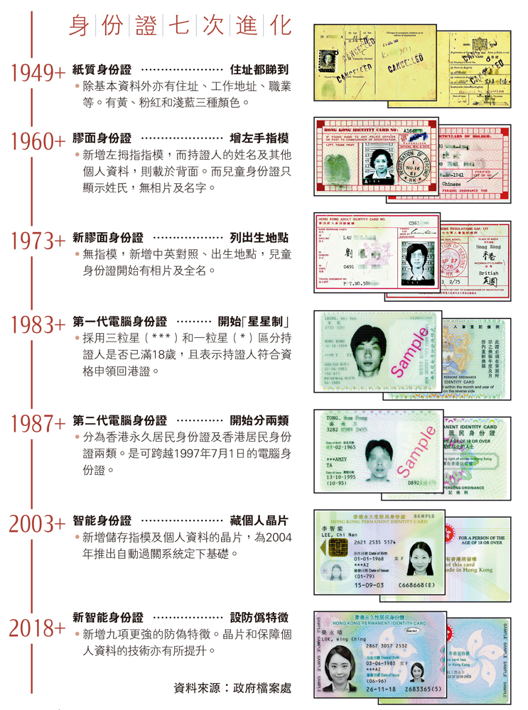 •分為香港永久居民身份證及香港居民身份證兩類。是可跨越1997年7月1日的電腦身份證。