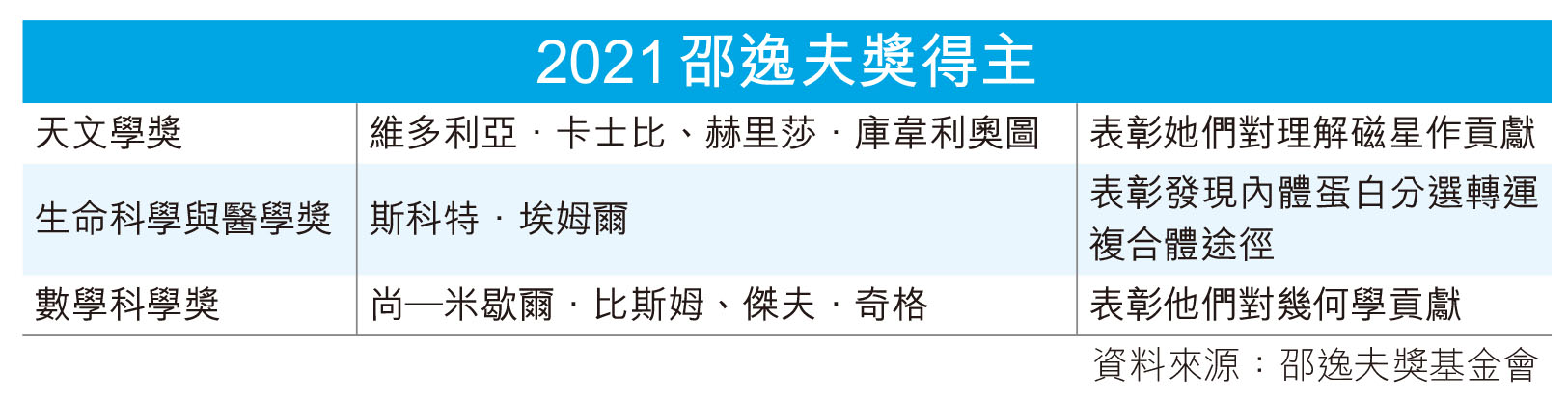 為讓公眾了解今屆「邵逸夫獎」得主及其貢獻,香港科學館今日起至明年1月5日舉行「2021邵逸夫獎展覽」,闡述相關學術領域的基礎科學知識,詳情可瀏覽網頁hk.science.museum/ms/shaw2021。