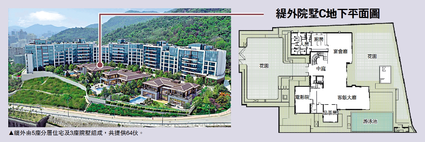 緹外昨日上載樓書,提供64伙,包括3座院墅及61間分層大宅。3座院墅實用面積11382至11692方呎,4房4套或5房5套設計,每座均特設逾萬方呎前後花園、升降機、私人停車庫及泳池,據知較特別之處,是泳池可以升高,在冬天時作其他用途。