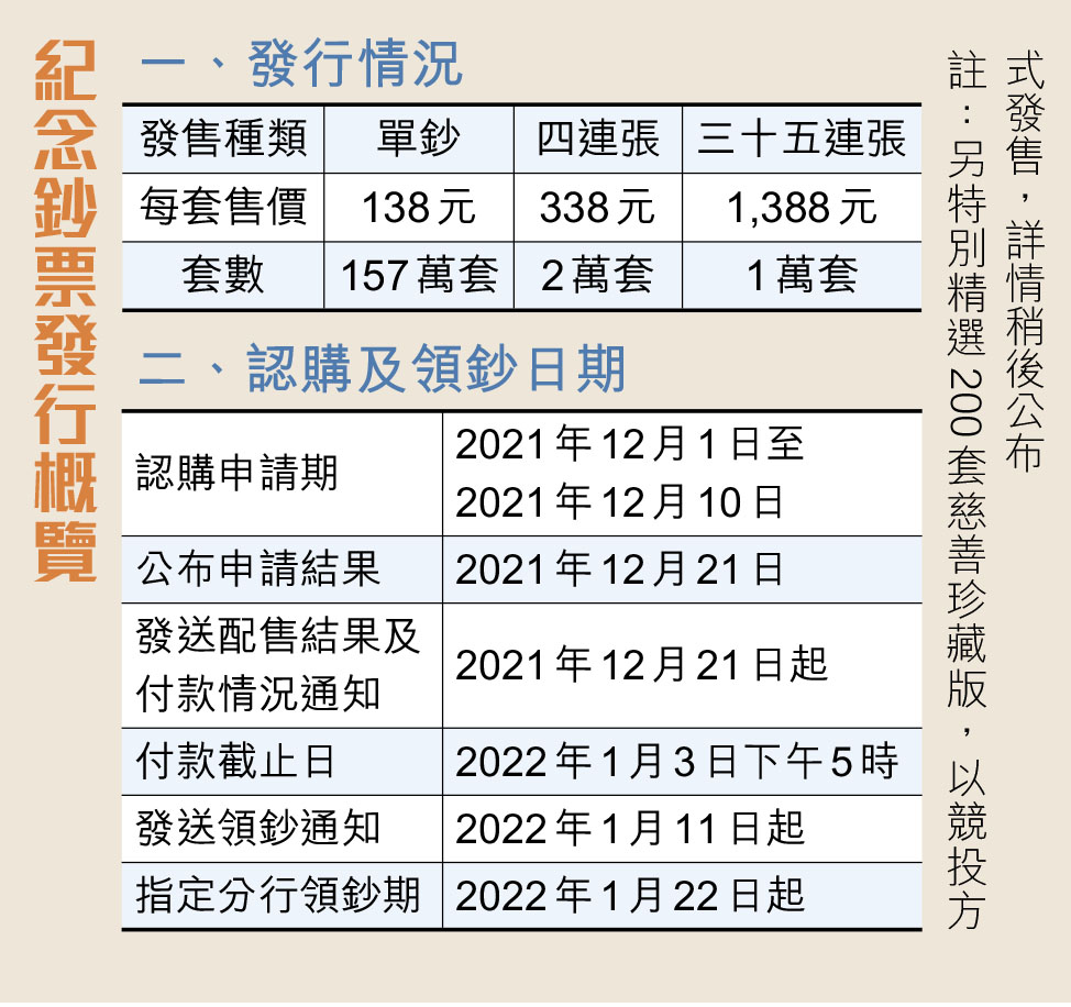 為慶祝和紀念北京2022年冬奧會,中銀香港將特別發行港幣20元面值的北京2022年冬奧會紀念鈔票,發行量200萬張,下周三(12月1日)起至12月10日接受今年滿18歲本港市民認購申請,其中單鈔佔157萬套,每套138元、四連張共2萬套,每套338元及三十五連張共1萬套,每套1,388元。中銀並精選200套慈善珍藏版,供公眾競投。是次紀念鈔票以唐詩寫月名句「天涯共此時」為設計理念,寓意香港市民心連冬奧,情繫祖國。香港目前仍面對疫情挑戰,中銀鼓勵市民透過網上申請(banknote.bochk.com/beijing2022)。