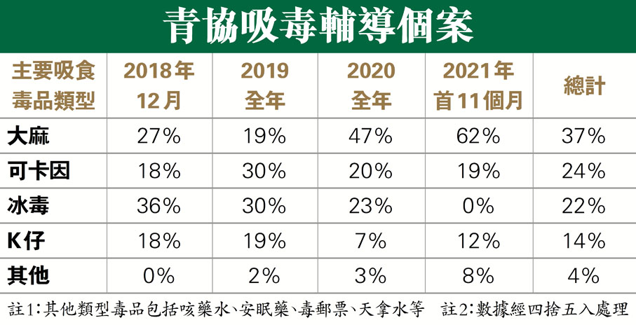 青協青年違法防治中心於2016年6月開始推出「Project RADAR─隱蔽吸毒及干犯毒品罪行輔導計劃」,透過大數據分析香港毒品帖文,搜尋追蹤高風險用戶。該中心青年工作幹事梁兆騏指出,該計劃共接觸199名青年個案,其中吸食大麻的個案由2019年佔整體19%,急升至今年的62%。他表示,大麻成為毒品主流的原因是不少青少年受社交媒體資訊誤導,對大麻產生誤解,「他們認為大麻與其他毒品不一樣,再加上受到外國吸食大麻狀況(合法化)的影響,就低估了大麻的風險性。」