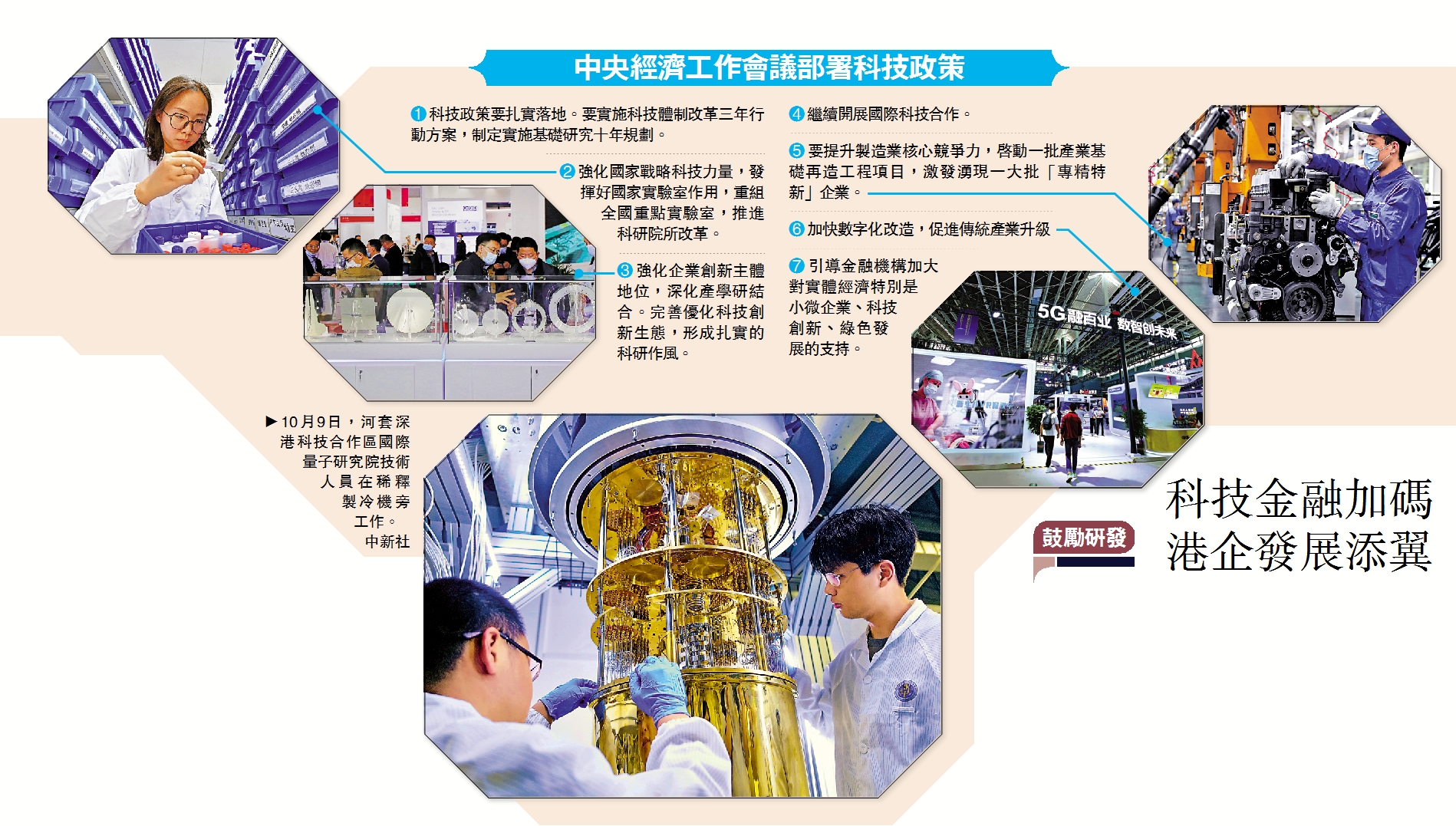 日前在京舉行的中央經濟工作會議,為明年的科技政策和科創工作明確了重點和方向。2022年國家科技政策如何推進?落地兩字是關鍵。中央經濟工作會議指出,科技政策要扎實落地。要實施科技體制改革三年行動方案,制定實施基礎研究十年規劃。強化國家戰略科技力量,發揮好國家實驗室作用,重組全國重點實驗室,推進科研院所改革。強化企業創新主體地位,深化產學研結合。國務院參事、全球化智庫(CCG)理事長王輝耀告訴大公報,國家的提法實際上是加強科技在整個生產力和創新當中的作用,粵港澳大灣區製造基礎雄厚,國際開放程度高,且正努力建設全球科技創新高地,當中蘊含的機遇無窮。\大公報記者 盧靜怡