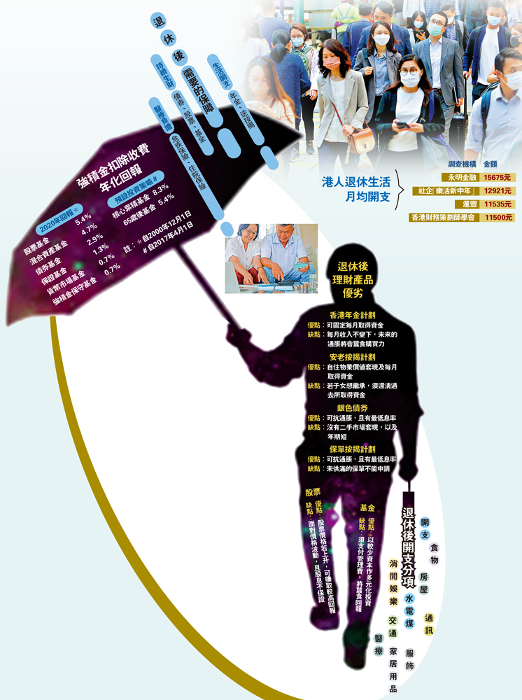 最後是利用儲蓄生財。每個打工仔在退休後,最基本都會取得一份強積金或公積金,打工仔可考慮將有關資產的一部分用於投資股票、基金及債券等,以取得一定回報,現時積金局及私人公司設有一些專為65歲後存放的投資基金,按有關人士的風險承受能力,作出不同的資產配置。以積金局公布的數據顯示,由2017年4月1日至2020年底,65歲後基金扣除收費和開支後的年化回報率為5.4%。