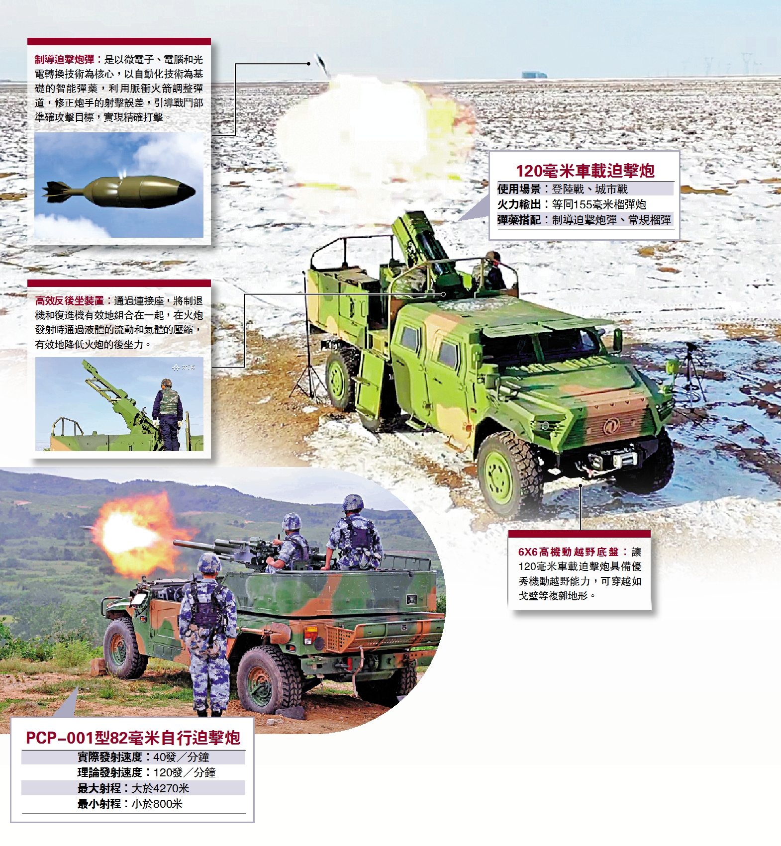 國產新型120毫米車載迫擊炮近日首次曝光,成為中國陸軍最先進的大口徑迫擊炮。以六輪猛士裝甲車為發射平台,由火控計算機自動解算射擊諸元,即停即射,一鍵調炮到位,整個過程僅僅需要30秒。另外,其配備了新型智能彈藥,彈藥發射後,可利用脈衝火箭調整彈道,按一定規律控制彈丸姿態,修正射擊誤差,引導戰鬥部準確攻擊目標。反應速度、打擊精度、火力強度等方面都有躍升,是實施山地作戰、空降作戰、城市巷戰的「曲射殺手」和「攻頂戰神」。此外,車載迫擊炮還可以發射末敏彈,對坦克實施「攻頂爆頭」。\馬浩亮(文)