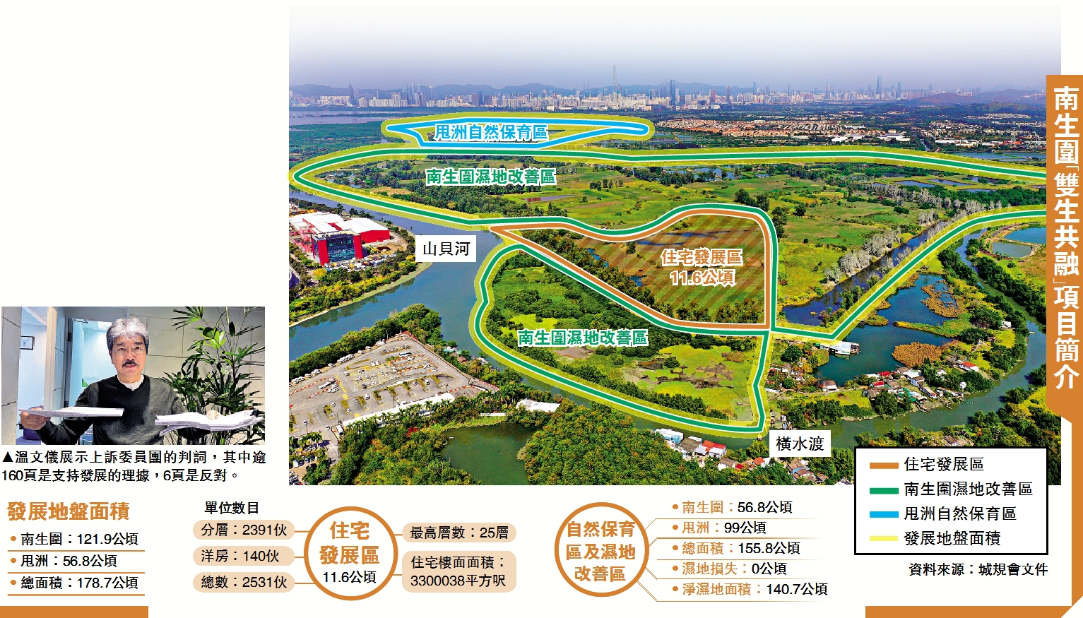 南生圍「雙生共融」發展計劃佔地逾178公頃,涵蓋南生圍及甩洲大片濕地,業權人向城規會建議發展其中11.6公頃用地,作住宅用途,興建約140幢洋房及分層住宅,提供逾2500個單位,包括約560個資助房屋單位,其餘用地則加強保育。申請早前獲城規會上訴委員團開綠燈。