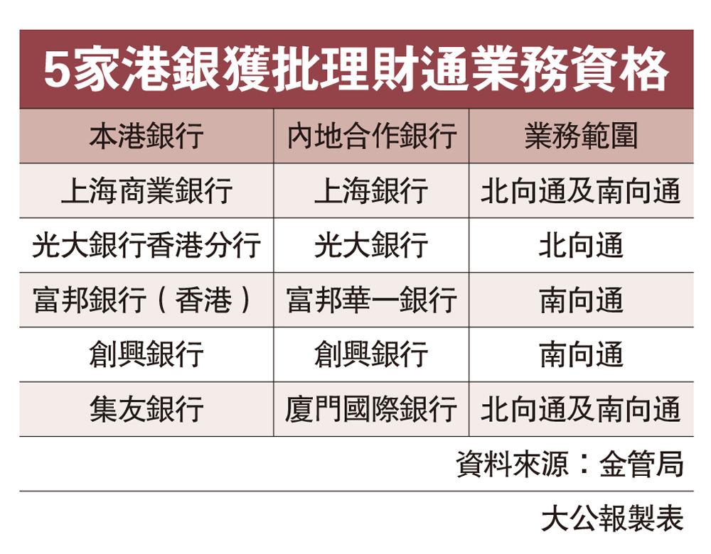【大公報訊】香港金融管理局昨日公布,本港再有5家銀行獲准可開展「跨境理財通」業務,令合資格香港銀行數目增至24家。新增的5家香港銀行分別是上海商業銀行、中國光大銀行香港分行、富邦銀行(香港)、創興銀行,以及集友銀行。(詳見附表)