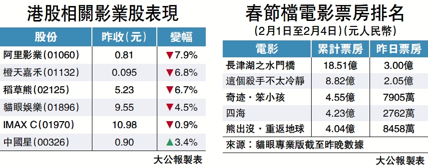 據燈塔專業版的數據,今年大年初一至初三的票房為35.05億元;總出票6404.45萬張,較去年同期的45.45億元及9176.49萬張,分別跌23%及30%。昨日港股虎年首日開市升近800點,但電影概念股卻逆市下跌,除個別股份如中國星(00326)收升外,普遍下滑。市場人士分析,春節檔票房不及去年,與票價高企及新冠肺炎變種病毒個案增加有關。