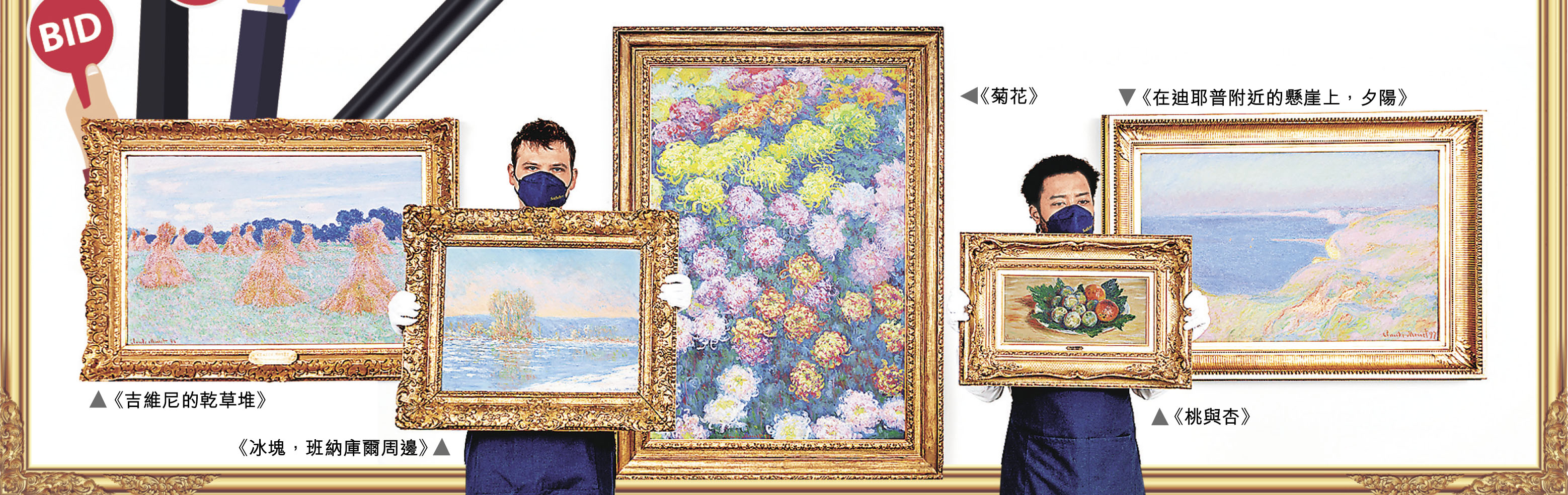 作品展現莫奈從表現主義畫家到抽象表現主義之父的轉變。作品包括估價1,500萬至2,000萬英鎊以穀堆為主題的傑作《吉維尼的乾草堆》;估價1,000萬至1,500萬英鎊、花團錦簇的《菊花》,徹底挑戰了靜物畫固有的悠久傳統,也反映畫家對日本的迷戀;捕捉塞納河浮冰情景、估價500萬至700萬英鎊的《冰塊,班納庫爾周邊》;以及估價350萬至500萬英鎊、描繪諾曼第海岸美景的《在迪耶普附近的懸崖上,夕陽》;最後一幅是估價120萬至180萬英鎊的《桃與杏》。全部作品均創作於19世紀,精煉地展現莫奈的現代精神對後世藝術家的深遠影響。