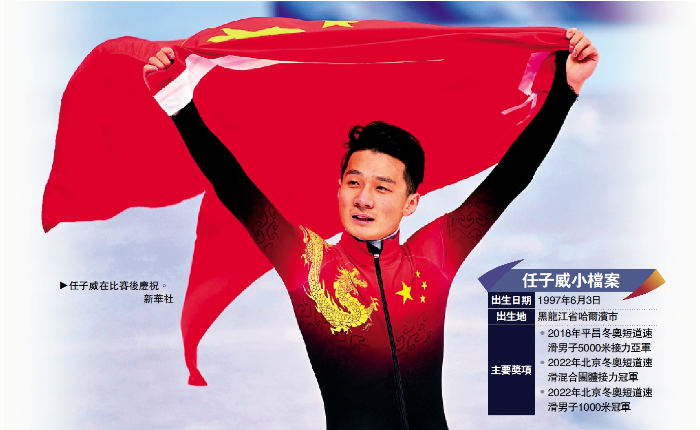 中國代表團在短道速滑再獲一金。北京冬奧會短道速滑男子1000米比賽,3名中國選手躋身決賽形成金牌「3保險」,最終任子威以1分26秒768為中國隊收穫本屆第2金,李文龍獲得銀牌,加上蘇翊鳴在單板滑雪男子坡面障礙技巧賽的歷史性銀牌,助中國隊單日進賬1金2銀。\大公報記者 郭正謙冬奧直擊