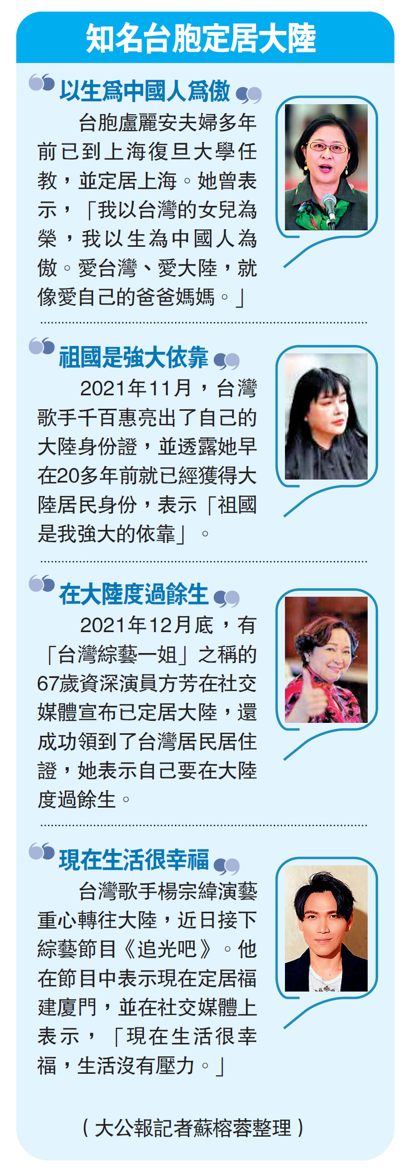 2021年11月,台灣歌手千百惠亮出了自己的大陸身份證,並透露她早在20多年前就已經獲得大陸居民身份,表示「祖國是我強大的依靠」。