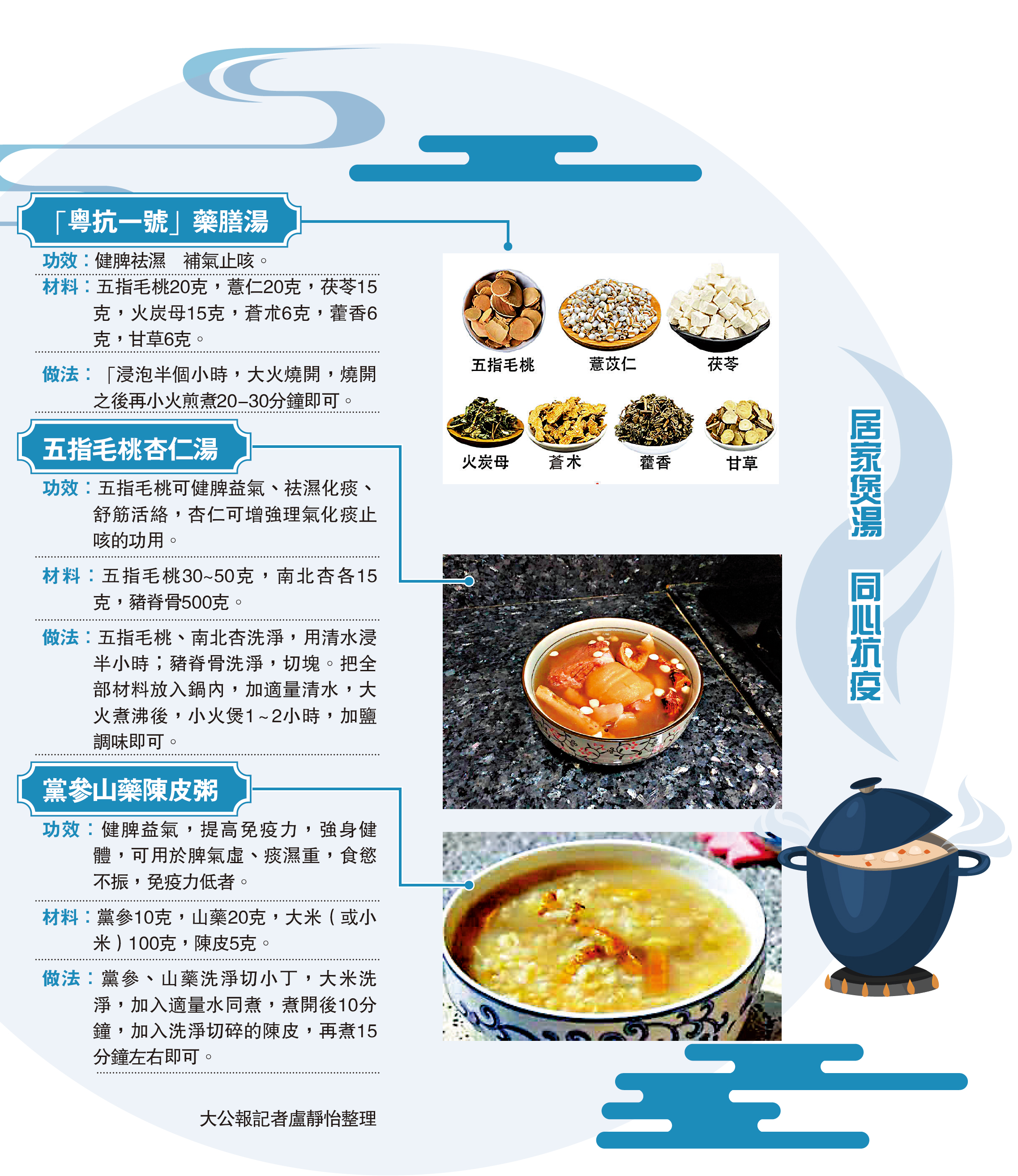 材料:五指毛桃20克,薏仁20克,茯苓15克,火炭母15克,蒼朮6克,藿香6克,甘草6克。