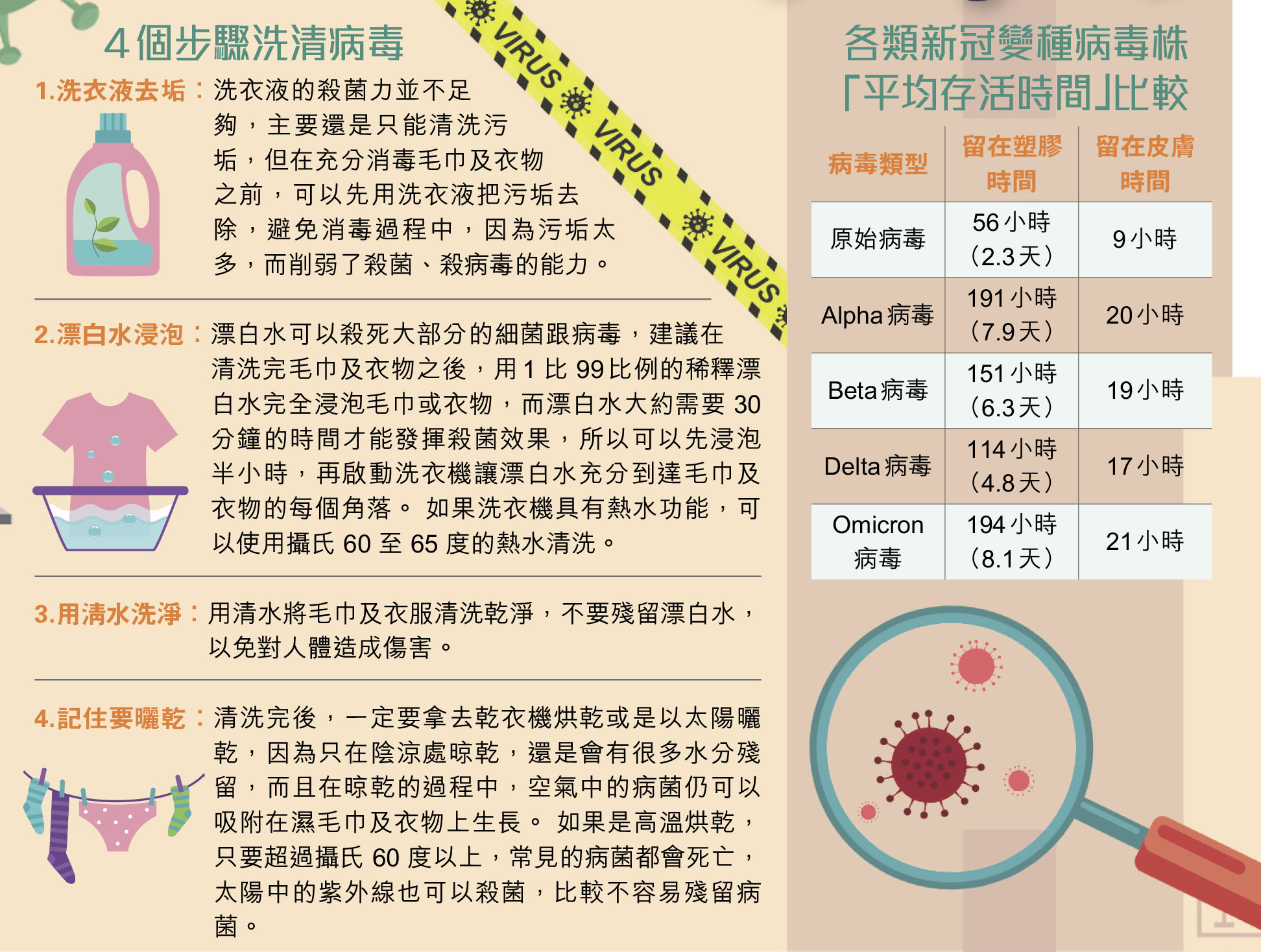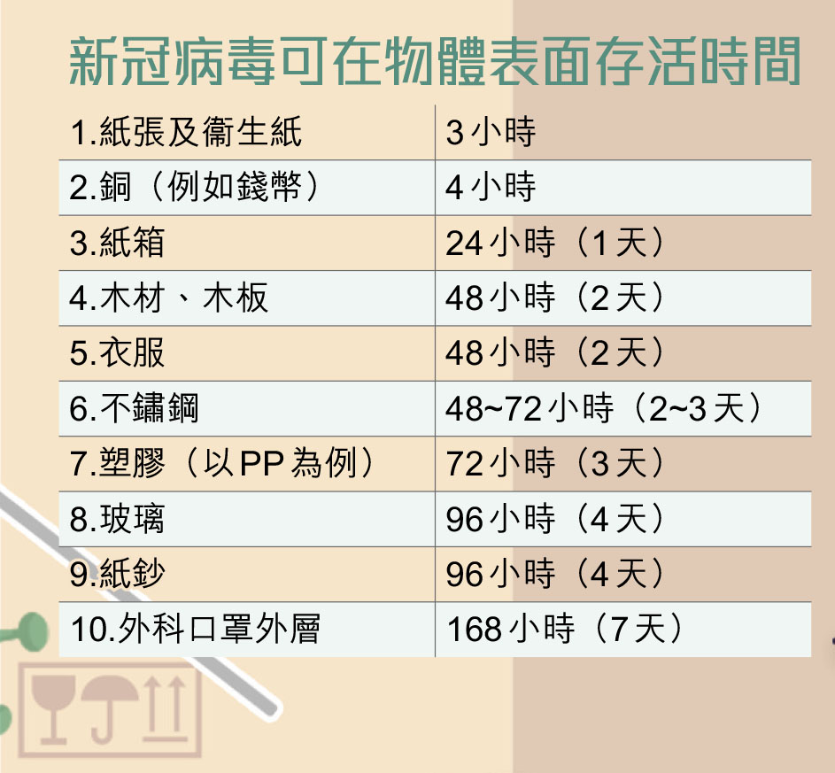 根據日本上月一項研究顯示,新冠變種病毒Omicron停留在塑膠上可存活時間平均長達8.1天,在皮膚上的平均存留時間為21小時,比起原始病毒株及其他目前已知的變種病毒時間都要長。不過,研究人員指出,所有變種病毒株只要接觸酒精搓手液15秒後,便可完全被殺滅,故只要繼續使用消毒劑保持雙手衞生,在接收包裹時做足消毒程序,外出後徹底清洗衣物,仍可有效防止病毒傳播。
