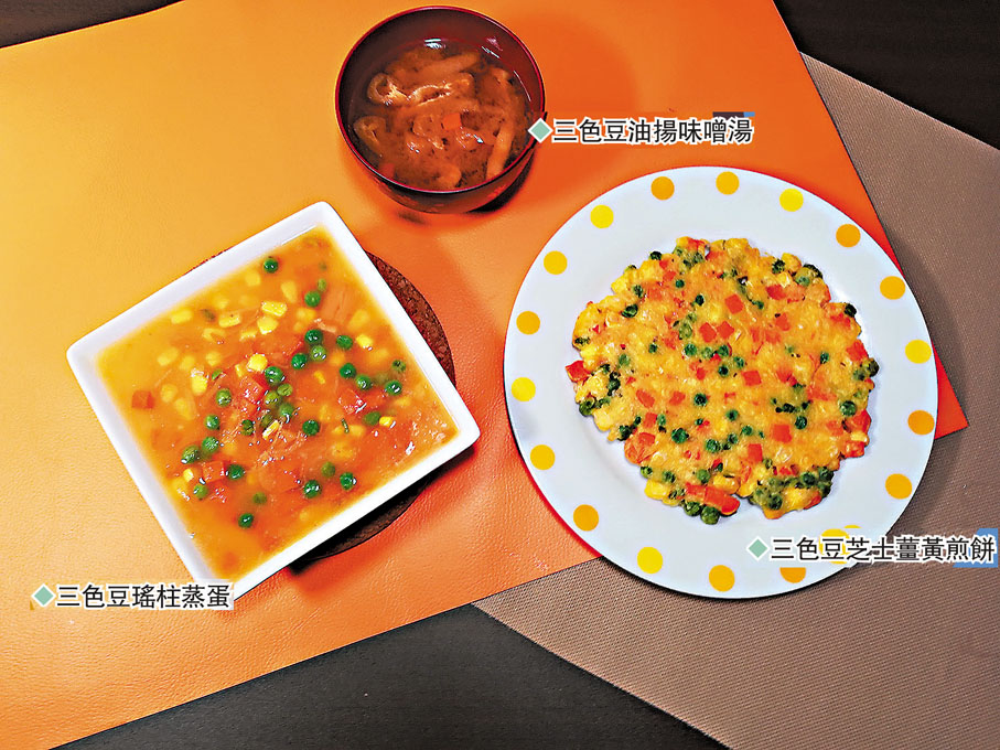 三色豆是大家對由胡蘿蔔、甜玉米及青豆組成的冷凍混合蔬菜的叫法,由於三色豆已經切成丁粒,所以烹調非常方便,加上它含有廣泛的礦物質、膳食纖維及維生素,可以說是一種具均衡營養的食材。而且,它含有水分、蛋白質、脂質、碳水化合物、食物纖維、鉀、鈣、鎂、磷、鐵、鋅、維生素A、維生素B1、維生素B2及維生素C等,這些都是身體新陳代謝必需的成分。加上,三色豆顏色亮麗,以之入饌可以添加菜餚色彩,烹調百搭。今期,就準備了三款三色豆菜式,為大家的餐桌添上繽紛色彩。◆文、攝︰小松本太太