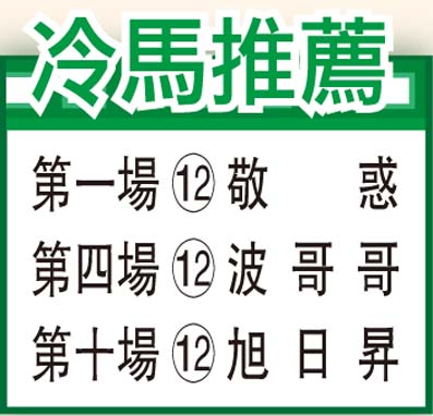 第十場、第二班、一四○○米。「旭日昇」賀廄今季四歲新貴之一,原本夠分出爭打大賽,但最終幕後認為長力不足放棄,寧願留力返中距離搏殺,呢匹今季澳洲揀手貨,來港前最後三仗贏晒,途程由千四至千六米;上年十月在港初出先在短途摸底,翌戰潘頓增程千四米水到渠成,勇挫「拍馬難追」輕鬆造一分二十一秒正確厲害,剛賽初上二班跑入Q,看來贏上頂班指日可待。