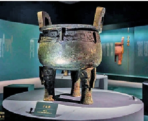 子龍鼎,通高一百零三厘米,口徑八十厘米,腹高四十三厘米,耳高二十二厘米,足高三十六點五厘米。因器內壁近口緣處鑄有銘文「子龍」而得名。「子」字稍小,「龍」字以雙線勾勒,生動傳神,似一豎立且尾部向右上盤卷的龍形怪獸。器頸部所飾,以雲雷紋為地,周飾是有首無身和首身完整的饕餮紋。兩種饕餮紋相間環列,向左右連續伸展構成整個紋帶,富有節奏。器足也飾有饕餮紋卷角如羊,角尖向內卷並凸起,與鼻樑處聳起的扉棱增強穩定性。