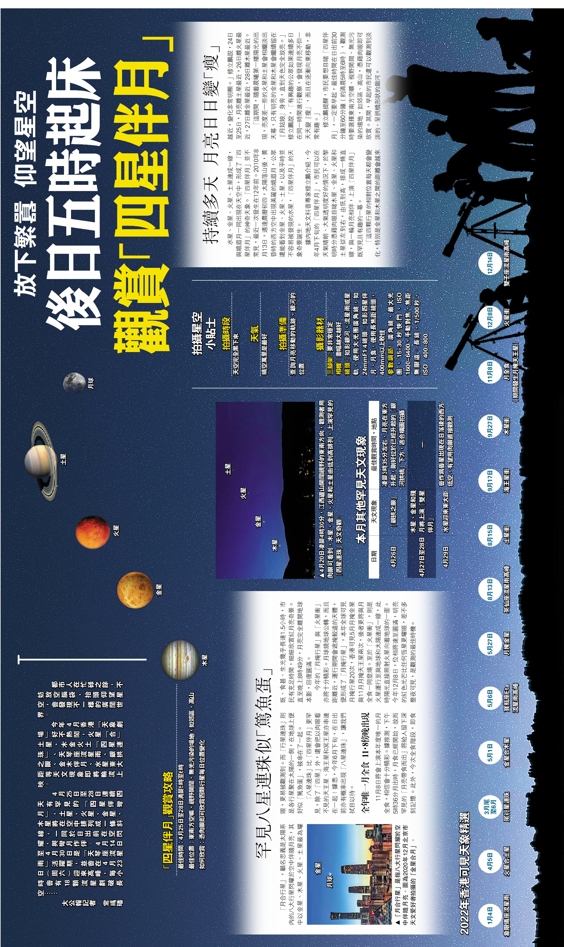 據內地天文科普專家修立鵬介紹,今年4月下旬的「四星伴月」,市民可以在天氣晴朗、大氣透明度好的情況下,於黎明時分憑藉肉眼目睹木星、金星、火星和土星從左到右,由低到高,排成一條直線,與一輪月亮相伴,上演「四星伴月」既罕見且有趣的一幕。