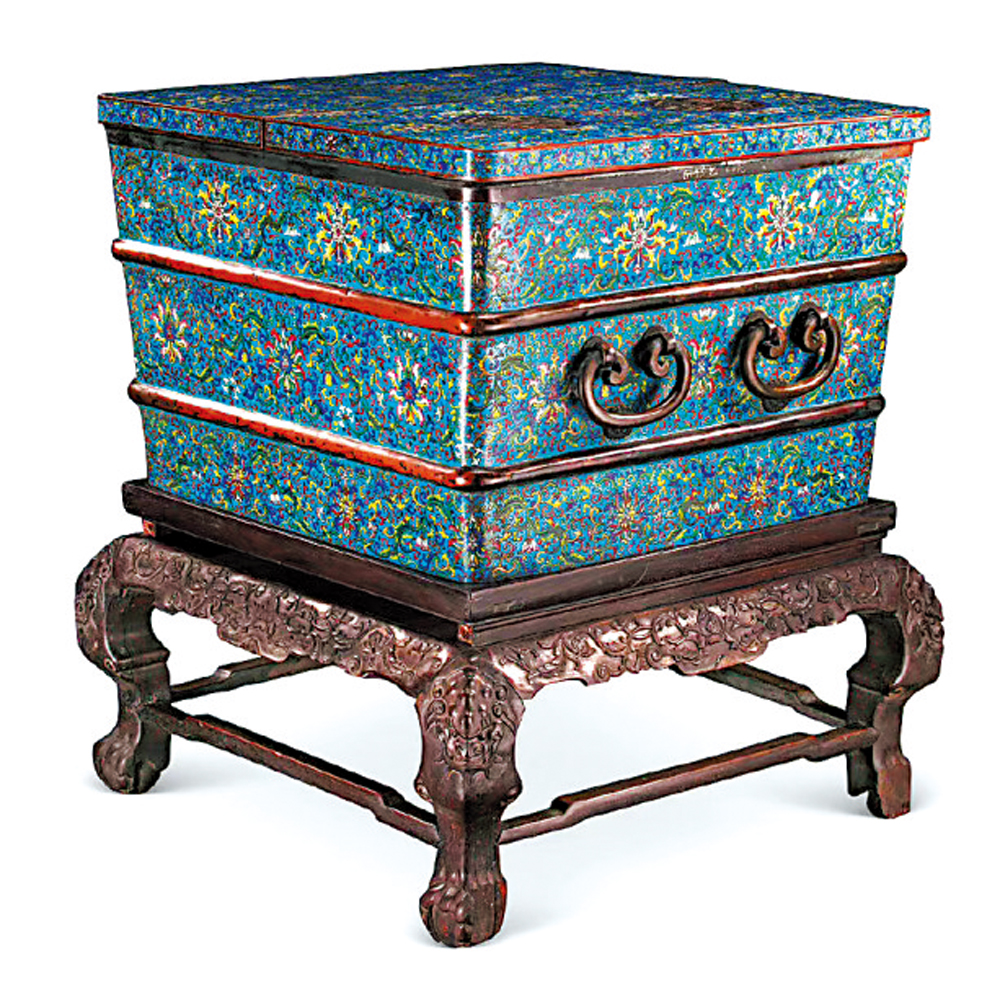 掐絲琺瑯,其製作一般在銅質的胎型上,將幼細銅扁絲掐成各種花紋焊於器表,然後以琺瑯釉料填進絲間,經焙燒、打磨、鍍金而成。因琺瑯釉多以藍色為主,故又俗稱「景泰藍」。這種冰箱不僅外形美觀,還兼具空調的功能。箱蓋上的鏤空通氣孔,用作通風散氣,冰融化時從裏面排出冷氣,有助降低室內溫度。其精巧設計不得不讓人感嘆前人的卓越智慧和先進理念。