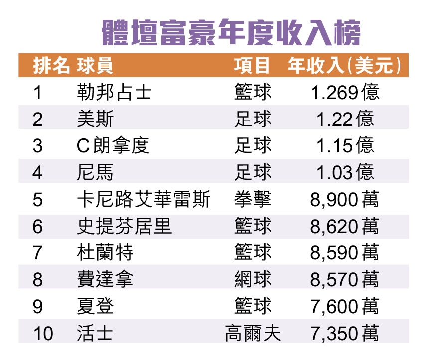 占士年收入登頂 力壓美斯C朗