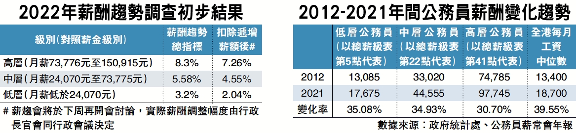 若以海外公務員制度作為參考,英國曾經實行與本港類似的「跳Point」制度,但由於2008年金融危機後英國公務員長年凍薪,多數部門也放棄了「跳Point」。根據英國智庫Institute for Government報告,2020年英國公務員整體年薪中位數為28180英鎊(折合港幣約27萬元),而高級公務員年薪中位數為81440英鎊(折合港幣約79萬元)。而在美國,每年由國會決定公務員加薪幅度。2012到2021年的10年間,聯邦僱員的薪級表(General Schedule)參考薪酬增長了10.9%。