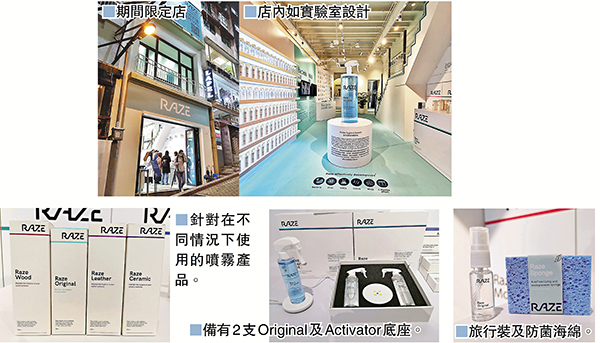 為讓市民認識這技術,由即日起至2月20日,品牌特於中環閣麟街設期間限定店,店內以「無菌·無污染」的實驗室為設計靈感,擺放了Raze Original的巨型展示,在燈光的配合下,透現出粒子被激活變成藍色的效果,展示室內空氣污染物的介紹和使用Raze產品的前後分別,同時更會介紹光觸媒技術,由深入淺出地解釋當中的原理。