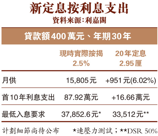 她舉例,假設貸款額400萬元,年期30年,以目前銀行實際按息2.5厘作計算,每月供款為15,805元。選用10年、20年及30年定息計劃,每月供款分別會增加525元、737元及951元,單計首10年的利息計支出,分別多出9萬元至逾16萬元,息率並不吸引。