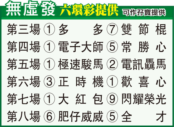 第六場「正時機」於澳洲出賽六次取兩冠一亞,曾勝千四及千六米,今季易廄後已有兩場實戰熱身,今次賽前由史卓豐一手操好,增程跑一哩正合時宜。「歡喜心」鐵馬跑谷中一哩最首本,如今減好分重返四班形勢可反客為主,屆時賠率非太熱,值得博反彈。