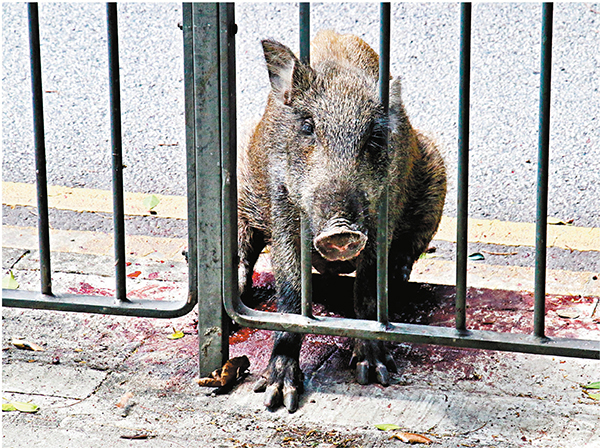 一頭約3呎長的大野豬昨晨在葵涌青山公路葵涌段覓食期間,疑橫過馬路時遇車受驚,慌不擇路下橫衝直撞,意外一頭撞入行人路邊的鐵欄,慘遭卡住頭部進出不得,受傷流血。警方接報後急召消防員到場撬開鐵支,再由漁護處人員將牠放入鐵籠運走交由獸醫檢查。 ■香港文匯報記者 蕭景源