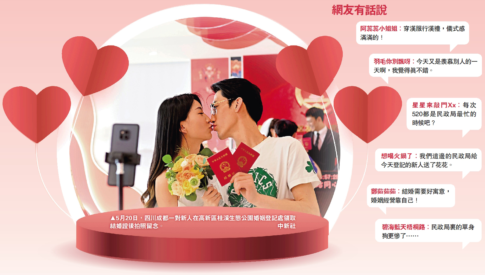 「520,我們結婚吧!」因為與「我愛你」諧音,每年的5月20日便成為內地越來越多準新人眼中寓意美好的日子,各地各級民政局婚姻登記中心也會在這一天迎來辦理結婚證的高峰。在「520」走進婚姻的殿堂,成為「執子之手,一生一世」最好的承諾。一年一度的「520」如期而至,各地民政局紛紛在「領證」上下功夫,從頒發「聖旨」婚書到「穿越漢朝」的「漢服體驗」未來感滿滿的「自動駕駛汽車試乘」,各式各樣的個性化領證服務為新人們的美好婚姻送上甜蜜的驚喜,留下永遠的回憶。