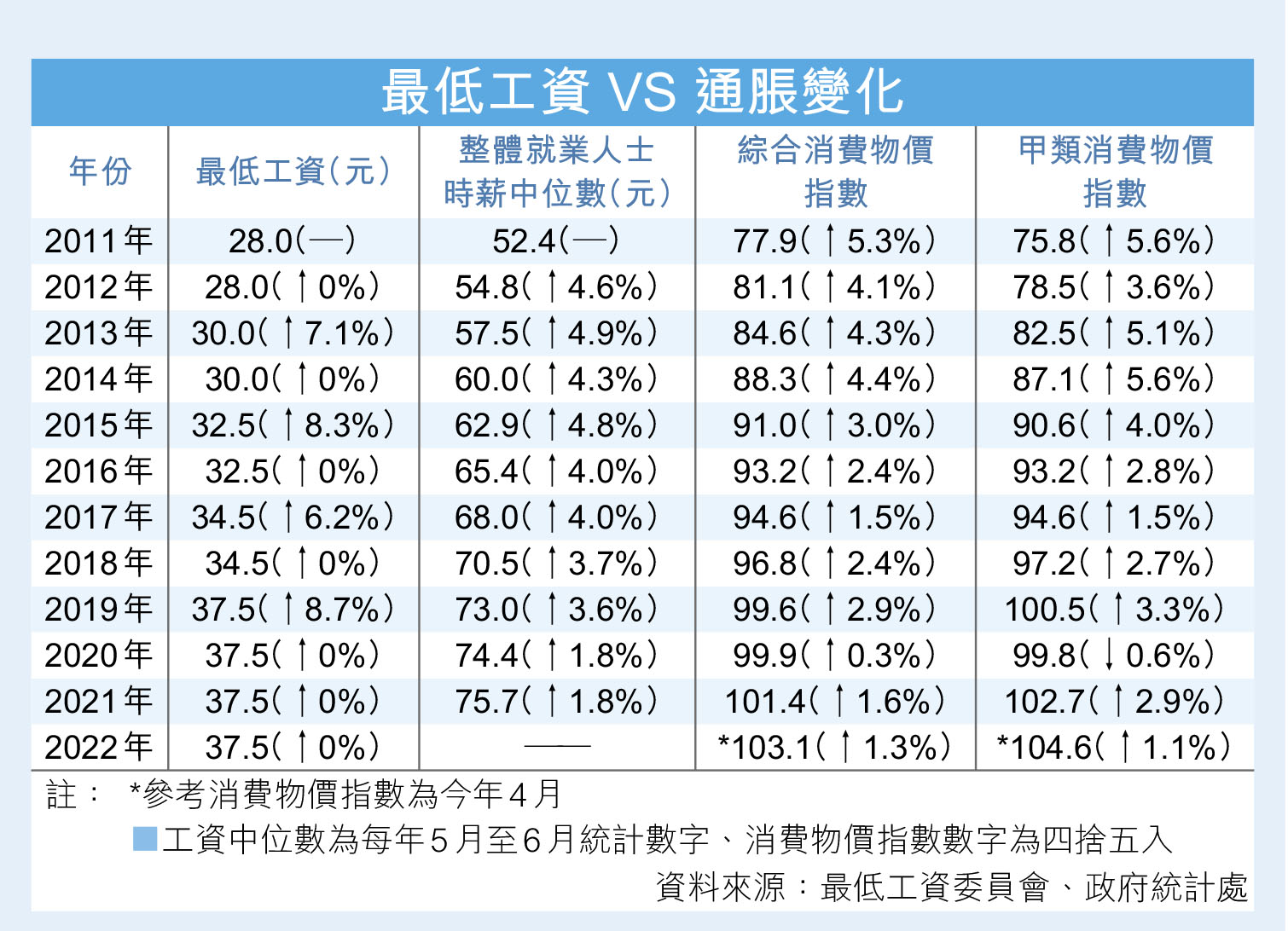 2011年5月1日《最低工資條例》實施,為保護香港勞工權益寫下歷史一頁,當年首個法定最低工資水平定為時薪28元,隨後「至少每兩年檢討一次」。條例實施頭幾年均是每兩年調升一次,升幅介乎6.2%至8.7%,以追趕通脹升幅。惟2019年香港遭受黑暴摧殘後,經濟走下坡,法定最低工資便由2019年起持續凍結,維持時薪37.5元。
