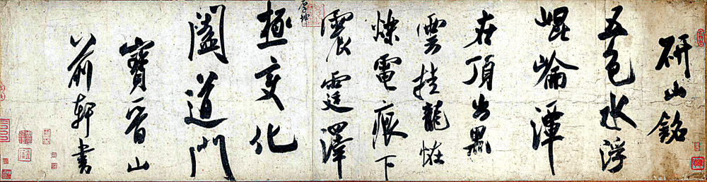 米芾行書大字傳世甚少,《研山銘》沉頓雄快,結字自由放達,跌宕多姿,不拘於前人的法則,可謂其法書的代表作。明末清初文獻著錄有《研山銘》傳本多件,此件原作卻一直秘藏不錄,直至近代輾轉流落日本。國家文物局於二○○二年成功競購此卷,後由故宮博物院收藏。