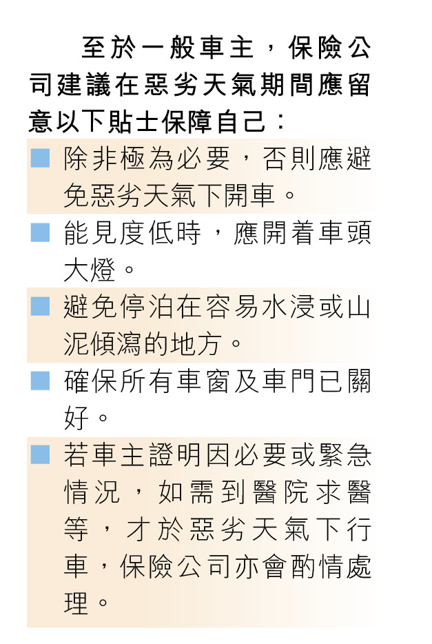 有的士司機不時以「打風黑雨保險唔包」為由坐地起價,究竟是否真有其事?一般而言,目前市場上的汽車保險分為綜合汽車保險(「全保」)和第三者責任保險(「三保」)。對於因颱風帶來的損失,兩者涵蓋的保障範圍大有分別。根據香港法例,任何道路使用者均須購買有效的第三者責任保險。「三保」責任保險的涵蓋範圍小,通常僅保障第三者財物損失及第三者死亡或身體損傷。因此,如發生意外,自身傷亡或車輛損毀是無法向保險公司索償。 不過,如果車主可以證實為他人失誤,如因停車場、管理公司疏忽,沒有在打風前做好防風措施,車主則可嘗試循民事索償,向有關團體追討損失,建議可在報警後要求獨立公證行來到現場評估情況。