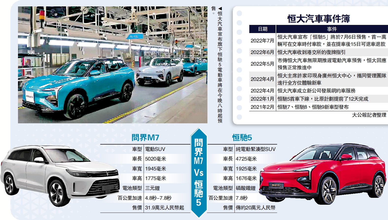 千呼萬喚始出來。恒大汽車(00708)公布,旗下純電動豪華SUV恒馳5將在今晚(7月6日)晚上八時預售,其賣點在於首一萬輛可在交車時付車款,並在提車後15日可退車退款,且購車款項支付及退回均在公證處專戶,但未有公布售價。另外,華為則搶先一步,昨公布和賽力斯聯手打造的電動車問界M7,同為SUV,預售價31.98至37.98萬元(人民幣,下同),並在預售2小時後訂單破萬宗。\ 大公報記者 李信