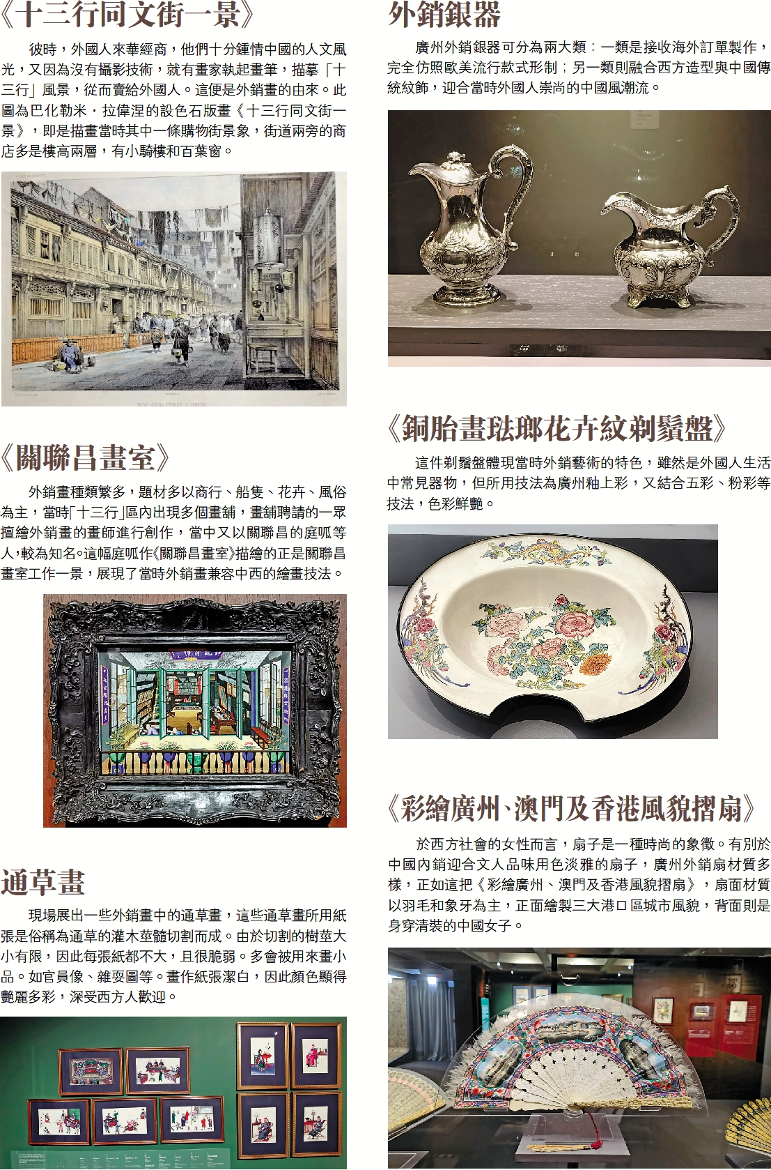 今次展出的一百二十組外銷藝術,類型涵蓋繪畫、銀器、瓷器、漆器、摺扇、牙雕等,可謂廣州曾經作為通商口岸,日常交易藝術品特色的真實寫照。